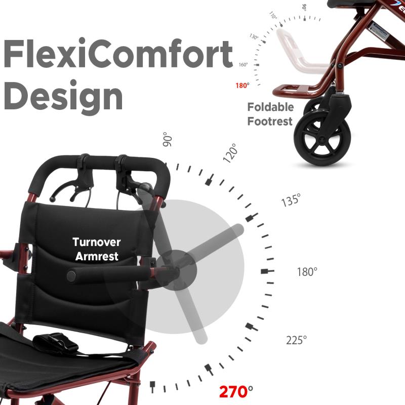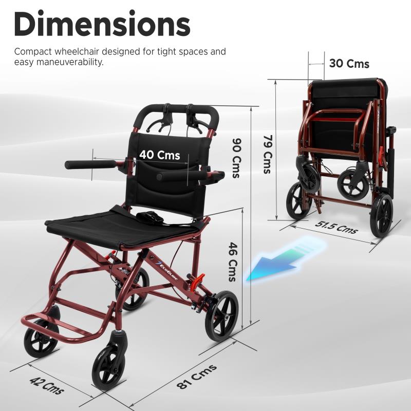 Transit-Friendly Design: With its full-size dimensions of 81cm length, 52cm width, and 90cm height, coupled with a transporter design, this wheelchair excels in narrow spaces. Its streamlined build facilitates effortless carrying and maneuvering, making it ideal for transit use.