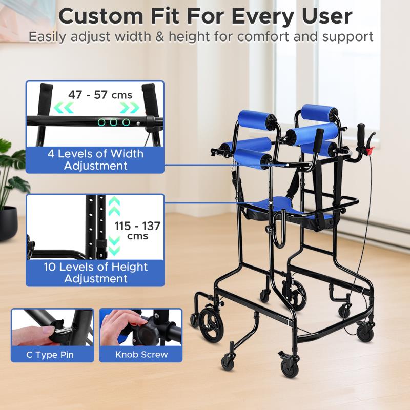 Multi-Detent Adjustability: Set forearm height precisely in 10 detents from 115–137 cm and lateral width in 4 detents from 47–55 cm to achieve neutral elbows, centered trunk, and consistent step symmetry with less wrist and shoulder strain; quick-lever clamps enable fast, repeatable tweaks between sessions and easy caregiver setup, supporting adults roughly 150–180 cm tall through progressive stroke, hemiplegia, or cerebral palsy gait-training programs.
