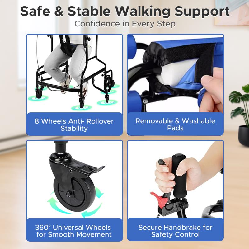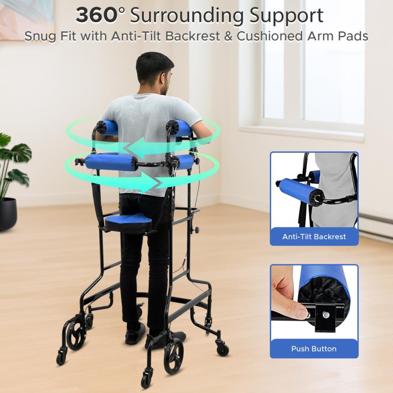 Comfortable Padded Support: High-density foam thorax rollers spread pressure for pain-free upright training, while a quick-rest sling lets users pause without leaving the frame. Detachable armrests and seat cushions feature sweat-absorbent, non-slip high-density sponges for added comfort. Soft surfaces wipe clean easily, and the open front allows foot clearance for step training, sit-to-stand practice, and endurance building with less fatigue and better posture.