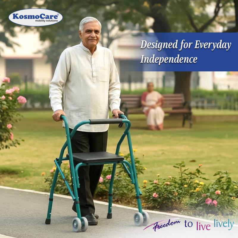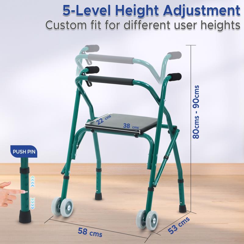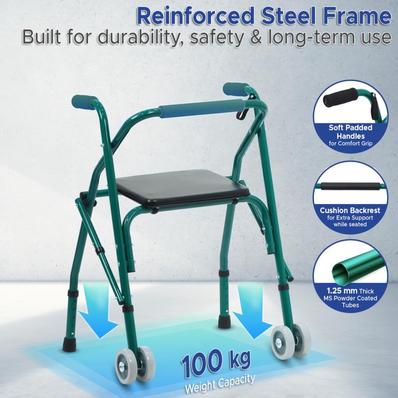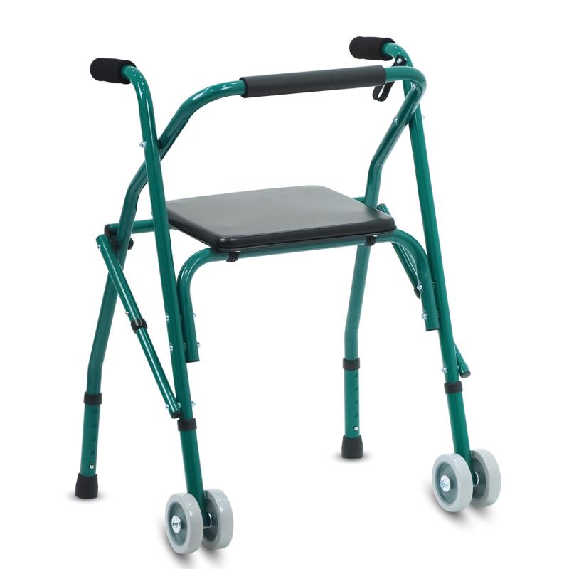 This durable light weight walker comes with a padded seat and backrest. It has dual front wheels for safety.