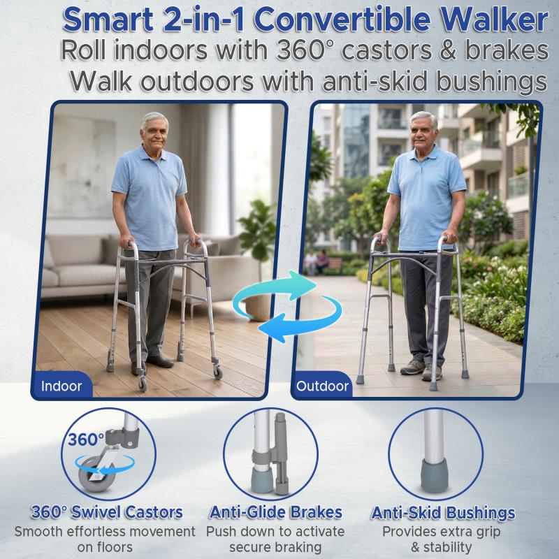 - 2 in 1 PREMIUM WALKER: Imported walker with 2 sets of attachments which can be used interchangeably indoors & outdoors. One set features 4 legs with anti-skid rubber tips. And the other includes 360° swivel wheels which enables the user to manuever the walker effortlessly without having to lift it & anti-glide brakes for added safety.