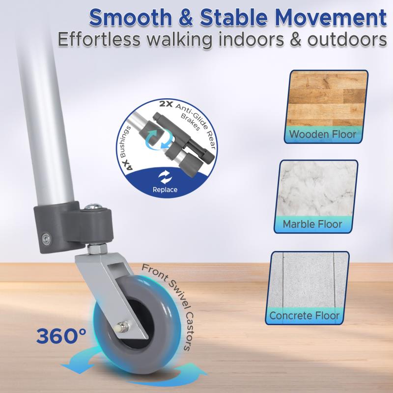 This advance model features - optional 360° swivel wheels. It gives the freedom to glide the walker and also aids during turning. The Brakes apply automatically when you put your load on the handle for stability and safety.