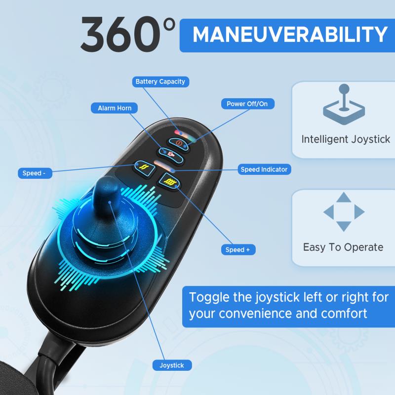 The power wheelchair is an exceptional mobility aid renowned for its extraordinarily long travel range up to 20 km with two 12AH high performance lithium battery.Torque motors enable the heavy-duty electric wheelchair to handle heavier loads than others, making it suitable for individuals with varying body weights. The 360 joystick allows the user to navigate the mobility scooter in any direction smoothly and precisely even in tight spaces. Also, the controller can be placed on the either left or right side of the armrest.