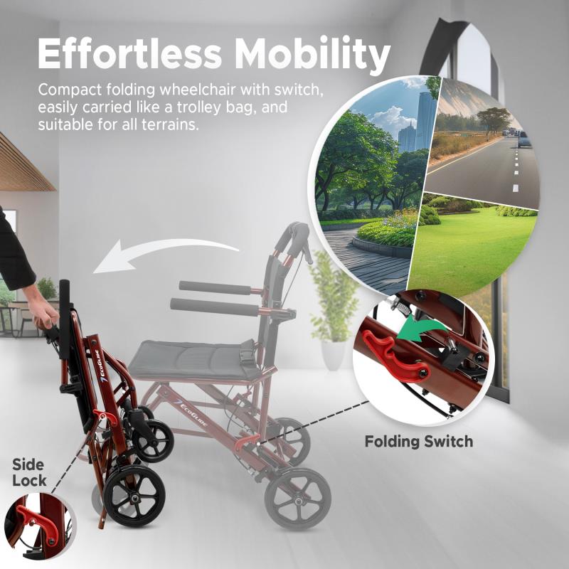 The KosmoCare Eco-Glide Premium Transporter Wheelchair is the ultimate solution for those seeking a lightweight, portable, and reliable wheelchair for travel and everyday use. Designed with high-quality materials and user-centric features, this wheelchair ensures comfort, convenience, and safety in every journey.
