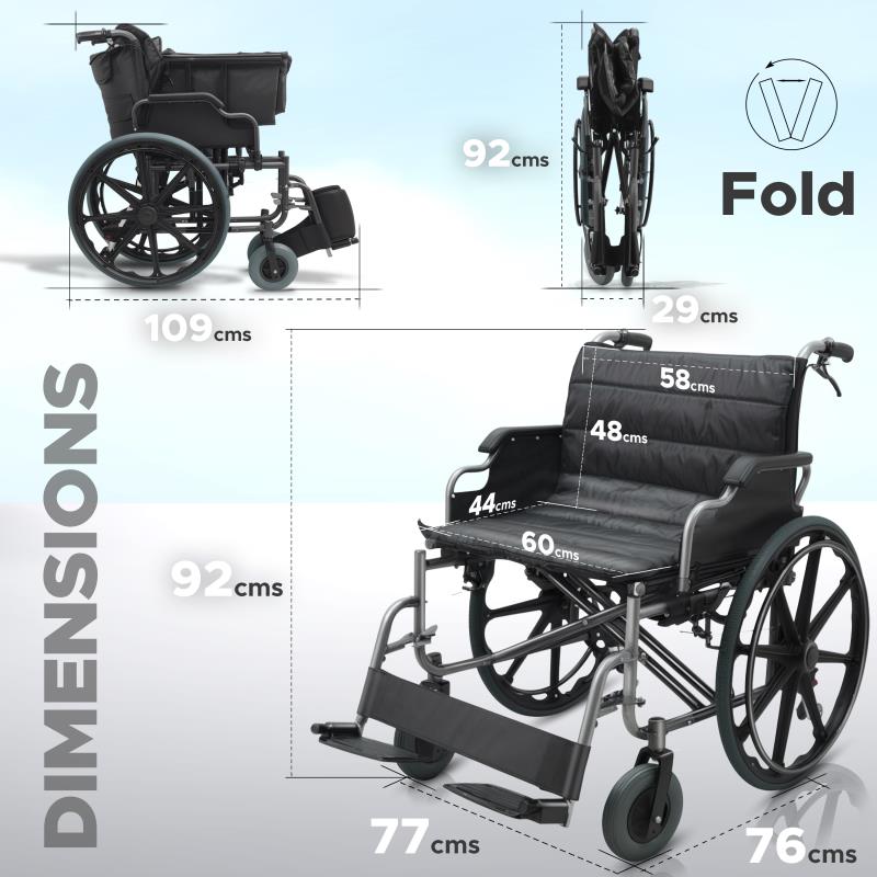 Robust Bariatric Design: Engineered for heavy patients, this bariatric wheelchair features premium metal attendant brakes for reliable stopping power and control. The reinforced frame and extra-wide seat provide necessary support and stability. It also includes a removable cushion for added comfort. With its robust construction and safety-focused design, this wheelchair offers secure handling and smooth maneuverability, ideal for both indoor and outdoor use.