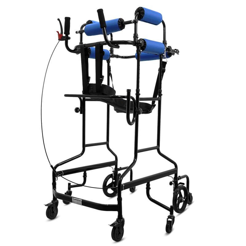 KosmoCare’s 8-wheel Gait Training Walker is an upright, anterior support solution engineered to help adults relearn and refine walking with safer posture and better balance. Multi-detent adjustability lets the forearm supports dial in exactly to the user: height sets in 10 steps from 115–137 cm and width in 4 steps from 47–55 cm, matching adults about 150–180 cm tall while promoting neutral elbows, a centered trunk, and more symmetric steps. A purpose-built wheel set underpins confident indoor mobility: front casters swivel 360° and can be locked straight for transfers and narrow corridors; side casters swivel freely for quick lateral corrections; primary 20 cm wheels include service brakes with a lever mountable on the right or left; rear casters swivel freely to keep pivots smooth. For comfort and endurance, high-density padded thorax rollers spread pressure, and the quick-rest sling allows short breaks without leaving the frame; the open front preserves toe clearance for step training and sit-to-stand practice, and wipe-clean surfaces simplify hygiene. The frame folds to a compact profile for storage or transport, with an easy-handle design that helps caregivers move it between rooms, cars, and therapy spaces. Built from reinforced high-carbon steel with a durable black finish, the walker supports up to 136 kg and is designed for daily rehab use; replaceable pads, serviceable hardware, and robust casters extend life, while hand and parking brakes add safety for starts, stops, and mid-session adjustments. This is a focused mobility aid for stroke, hemiplegia, and cerebral palsy rehabilitation programs at home or in clinic.