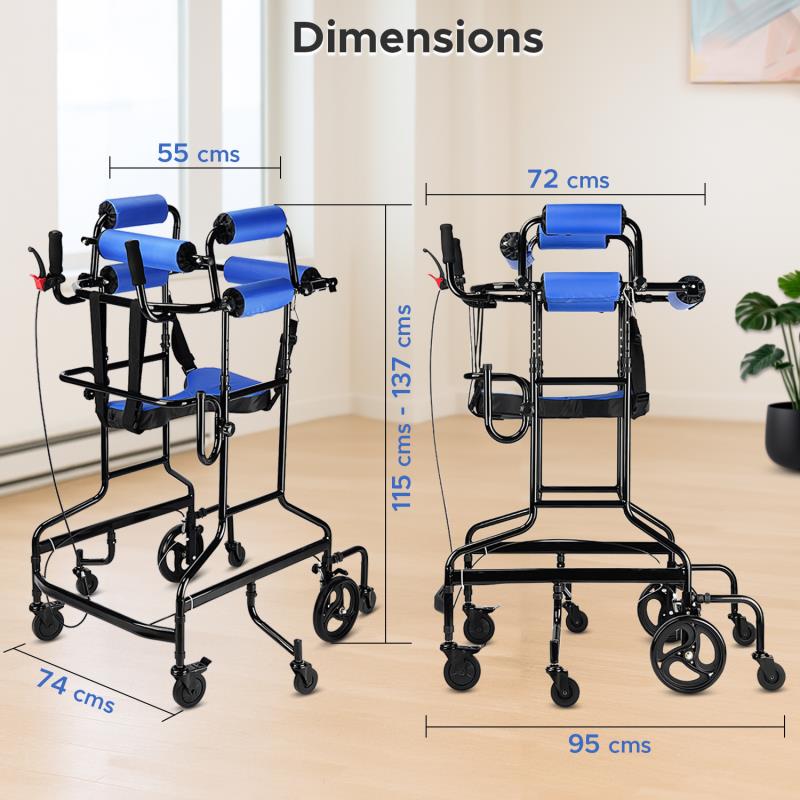 Easy Storage & Transport: The walker folds quickly to a compact profile for doorway passage, car loading, or closet storage between sessions. Overall dimensions are 95 cm (L) × 72 cm (W) × 115–137 cm (H), with a base depth of 74 cm and inner width of 55 cm for comfortable gait space. Locking joints keep the folded frame secure, while balanced weight and side handles let caregivers lift or roll it easily between home, clinic, or therapy centers