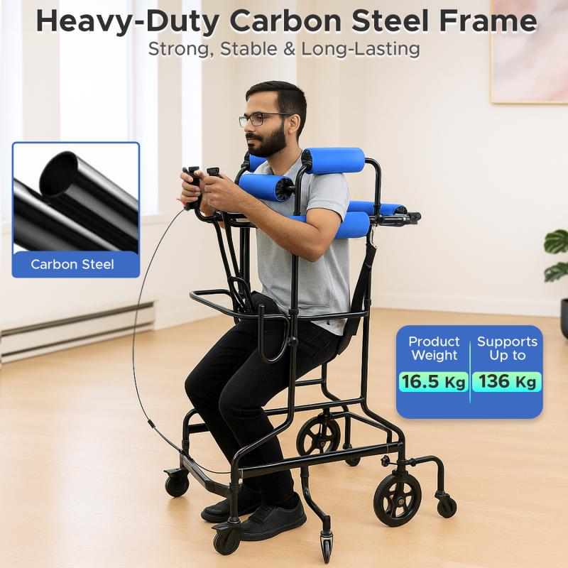 Comfortable Padded Support: High-density foam thorax rollers spread pressure for pain-free upright training, while a quick-rest sling lets users pause without leaving the frame. Detachable armrests and seat cushions feature sweat-absorbent, non-slip high-density sponges for added comfort. Soft surfaces wipe clean easily, and the open front allows foot clearance for step training, sit-to-stand practice, and endurance building with less fatigue and better posture.