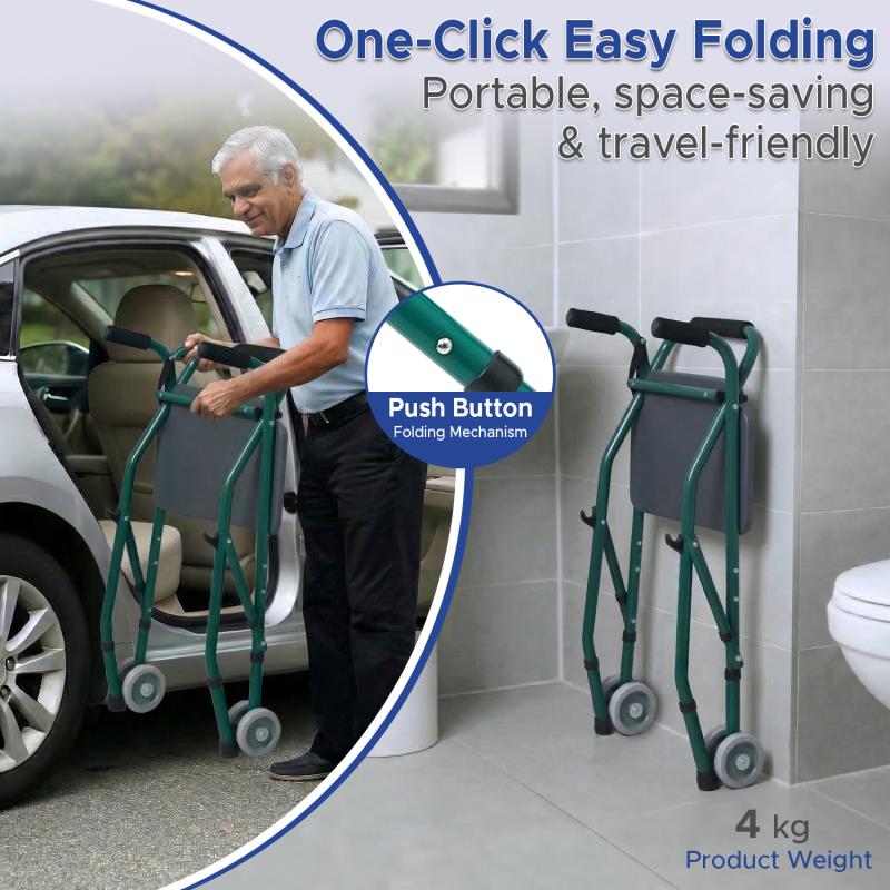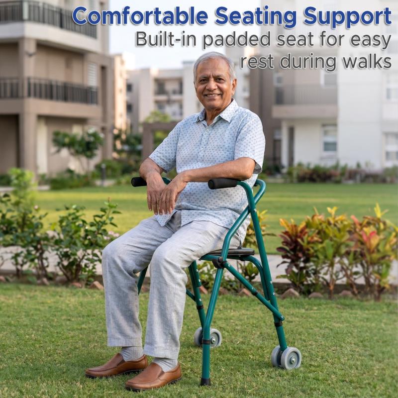 This durable light weight walker comes with a padded seat and backrest. It has dual front wheels for safety.