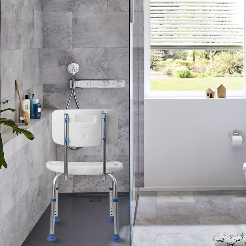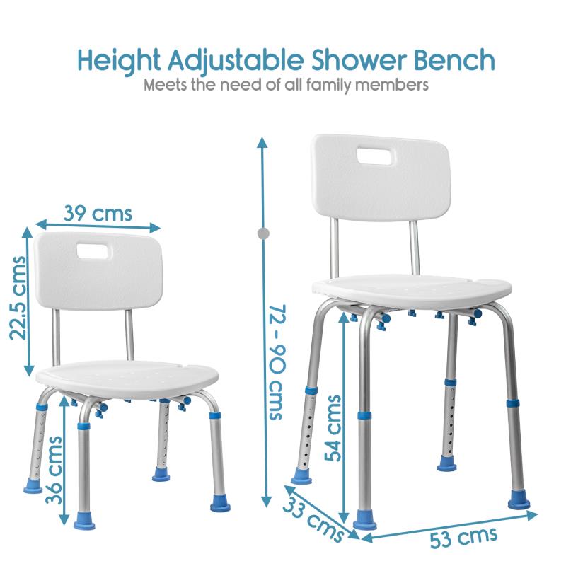- SHOWER BENCH WITH BACK: This universal bath bench with back fits any bathroom. Great shower chair for elderly and seniors. It is waterproof, corrosion & rust resistant, which makes it a ideal for you bathroom.