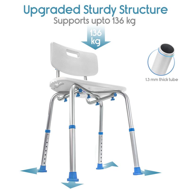 - DURABLE AND LIGHTWEIGHT: This shower chair is made from lightweight materials with high tensile strength, which makes it sturdy & heavy duty. The aluminium frame provides a high load-bearing capability up to 100 kgs.