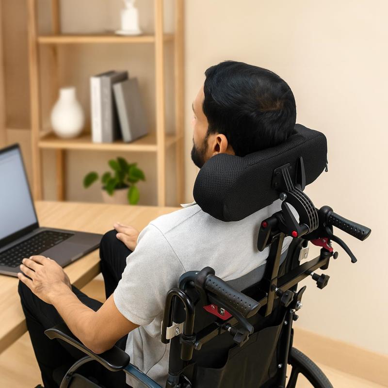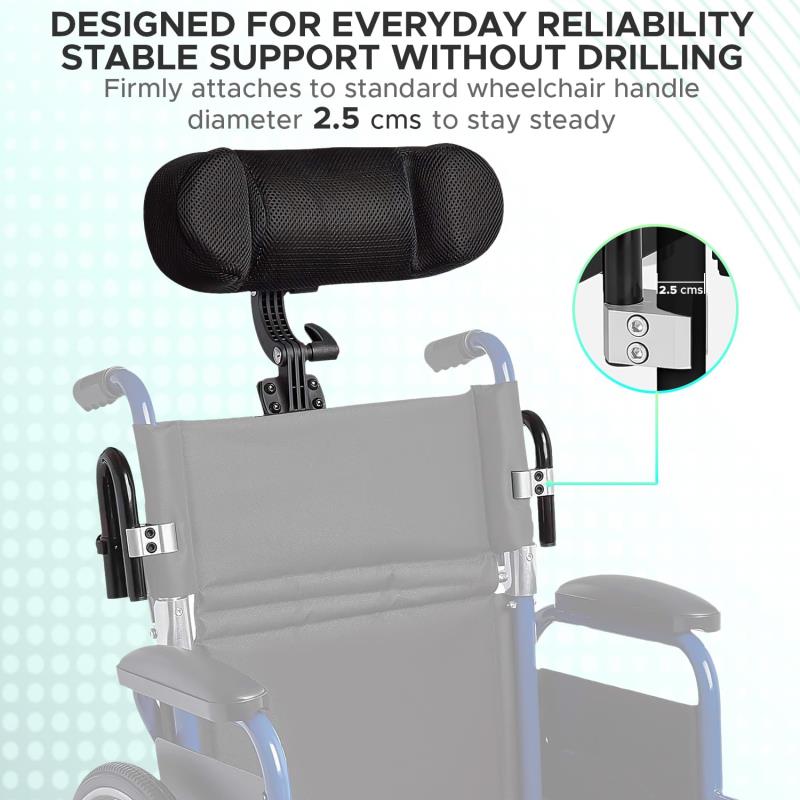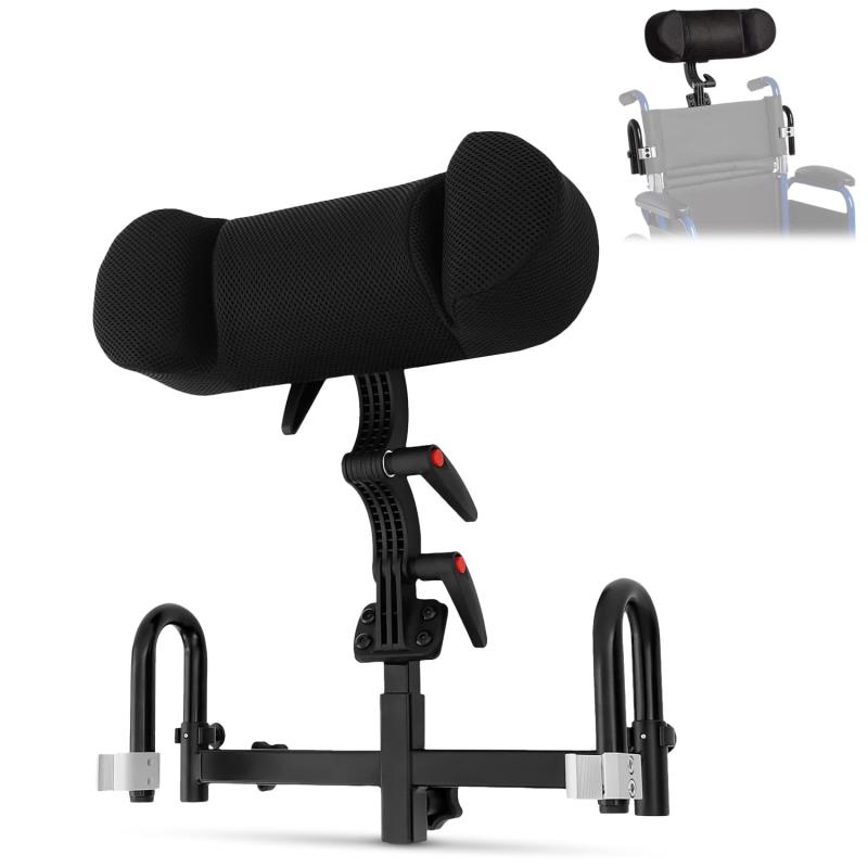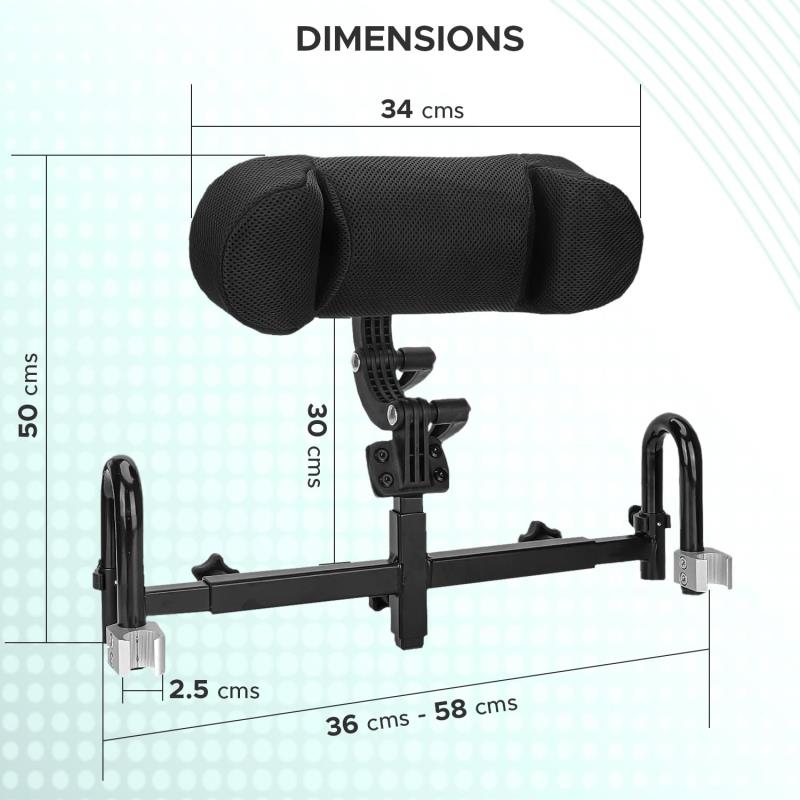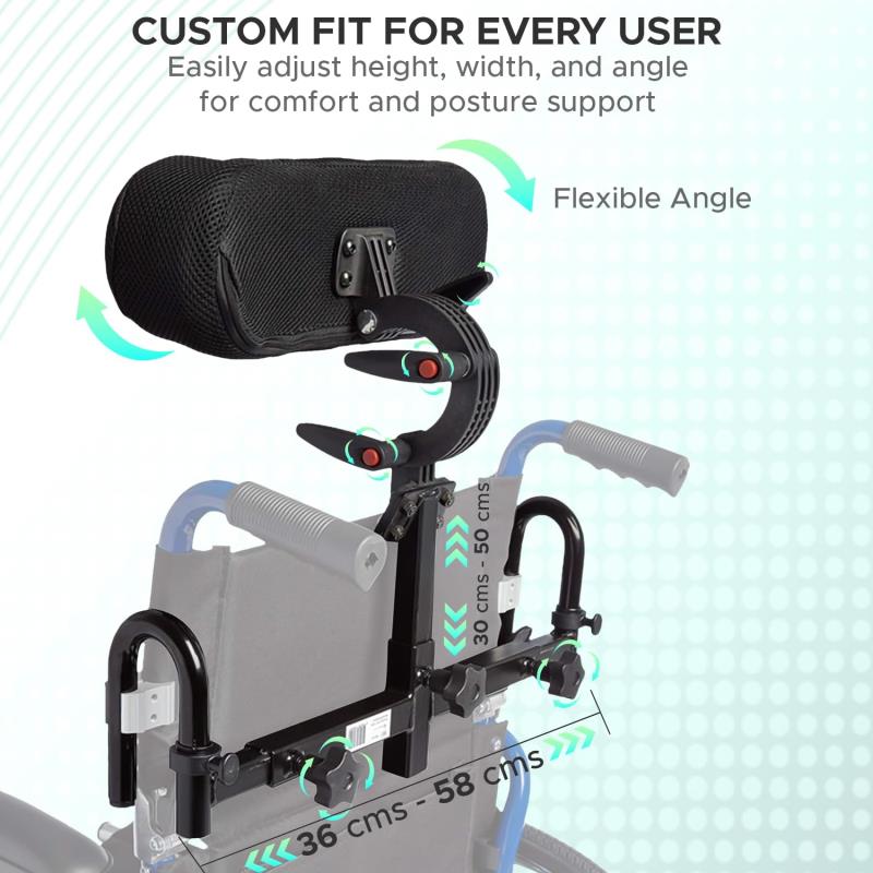 KosmoCare Adjustable Wheelchair Headrest is designed to bring reliable, customizable head and neck support to everyday mobility without modifying the chair. A universal clamping system fits most manual and powered wheelchairs by gripping standard push handles securely, so the headrest stays steady on city pavements, park paths, and indoor floors. Once mounted, positioning is precise and repeatable. Telescopic adjustment from 36–58 cm combines with a 50 cm overall height and a 30 cm rise from the frame, while three quick-adjust levers allow independent control of height and angle in seconds. Caregivers and therapists can fine-tune alignment to promote neutral posture, reduce fatigue, and support stable head control during therapy blocks, commutes, or long outings. Comfort is built into the cushion. The 34 cm contoured headrest with supportive side wings gently cradles the occiput to limit unwanted lateral movement. A high-density polyurethane mesh fabric cover enhances airflow and heat dissipation, and resilient padding maintains its shape to distribute pressure for extended sitting at home, school, or work. The rigid metal structure balances durability with portability, resisting scuffs and corrosion while staying light enough to move between chairs when needed. Installation and future adjustments are quick and intuitive, enabling ongoing fit optimization as seating needs change.