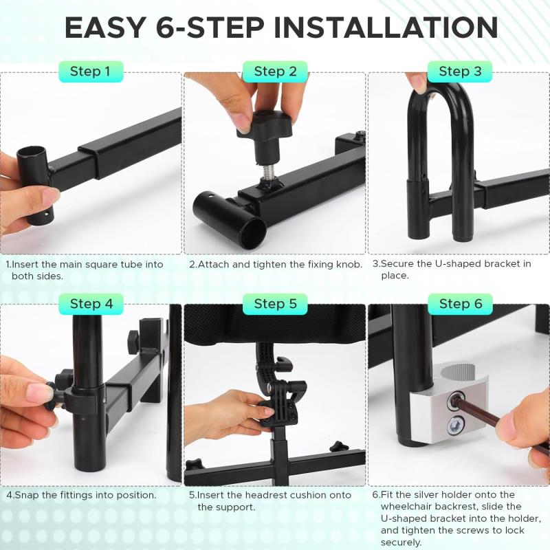 Easy Installation: Mounts in minutes using the included horizontal bar, vertical post, two L-arms, two U-brackets, four knobs, three clamp inserts, two clips, two screws, and Allen key. Adjustable hardware and 34 cm headrest length make fine-tuning simple.