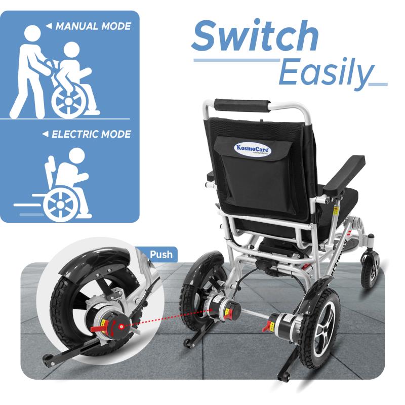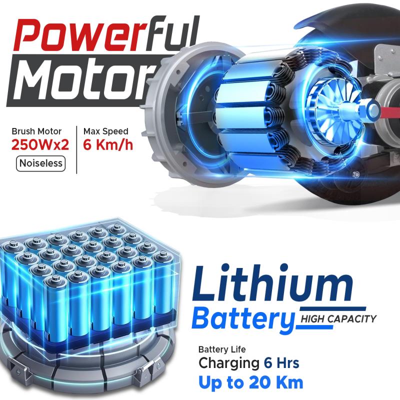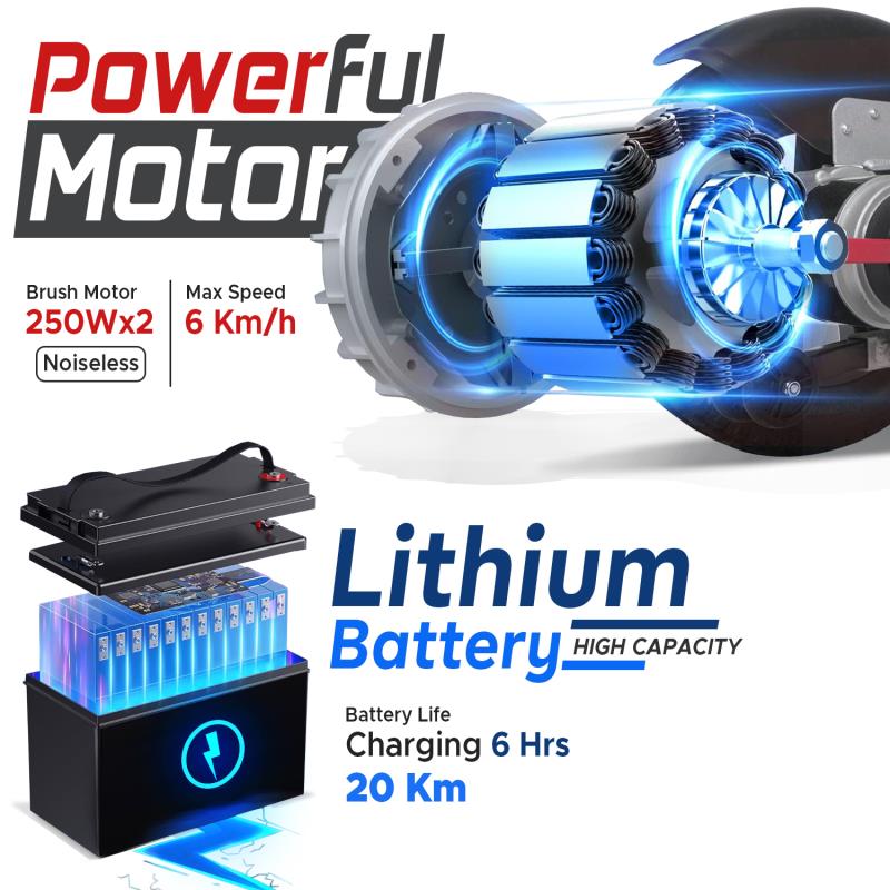Powerful Motor & Long-Lasting Battery: Equipped with dual 250W brush motors for strong, efficient performance. Powered by a 24V 12Ah lithium-ion battery (2.3 kg), the wheelchair delivers a dependable travel range of 15–20 km per charge, ensuring extended mobility with reliable power output.