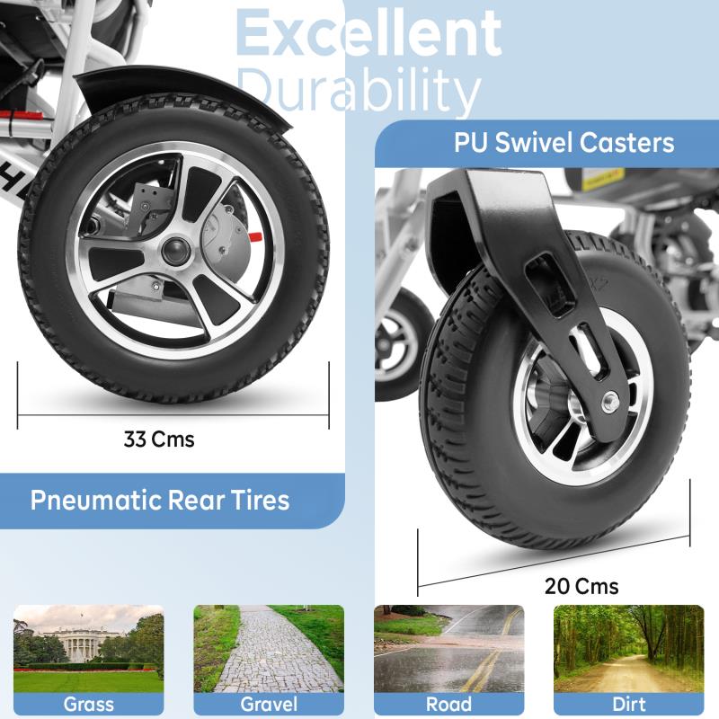 All-Terrain Wheels with Electro-Magnetic Braking: Conquer diverse landscapes with ease, and enjoy the added safety and control of electro-magnetic braking. Our all-terrain wheelchair, capable of climbing slopes upto 10°, provide exceptional stability and traction, making it easy to navigate various surfaces, from city streets to rugged trails, while the braking system ensures you can stop precisely when needed.