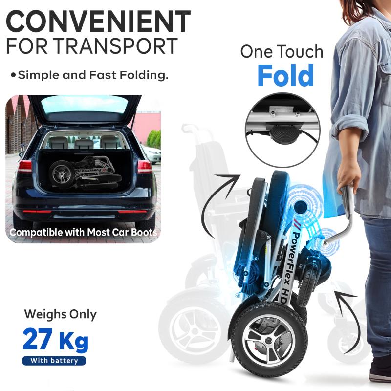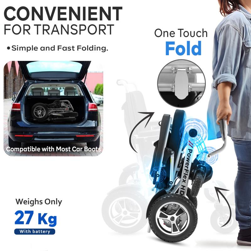Lightweight & Durable Build: Offers the perfect combination of lightweight portability at 28 kg (with battery) and rugged strength. Its one-touch foldable design with compact folding dimensions of 38 cm (L) x 81 cm (H) allows caregivers to roll it on wheels without lifting, making storage and transport simple and effortless.
