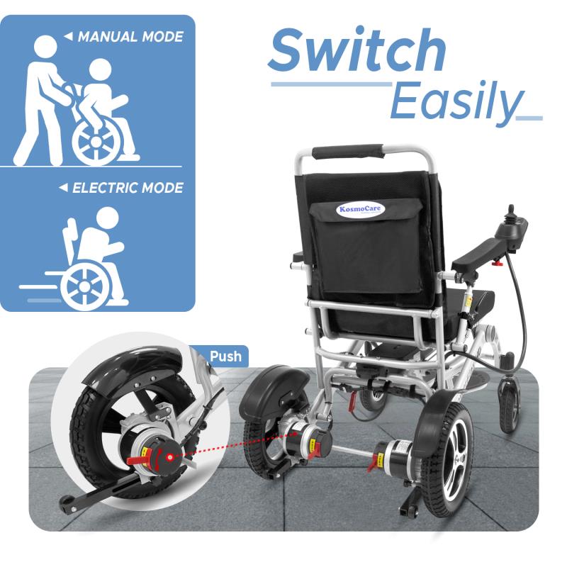The power wheelchair is an exceptional mobility aid renowned for its extraordinarily long travel range up to 20 km with two 12AH high performance lithium battery.Torque motors enable the heavy-duty electric wheelchair to handle heavier loads than others, making it suitable for individuals with varying body weights. The 360 joystick allows the user to navigate the mobility scooter in any direction smoothly and precisely even in tight spaces. Also, the controller can be placed on the either left or right side of the armrest.
